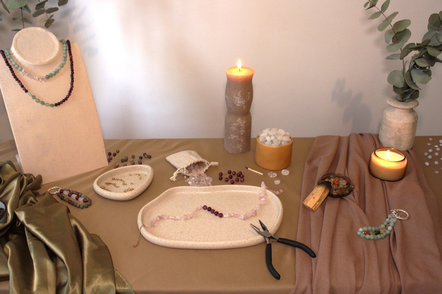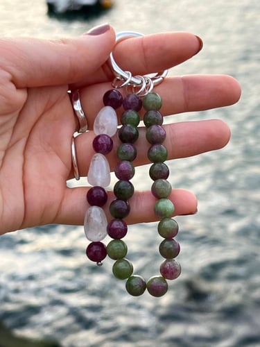Cada collar está diseñado y hecho a mano por mí, en mi taller en casa. Trabajo con piedras naturales y gemas, buscando combinaciones de colores que transmitan armonía. Me gusta cuidar lo que hago y que quien lleve una pieza sienta que hay algo especial detrás.